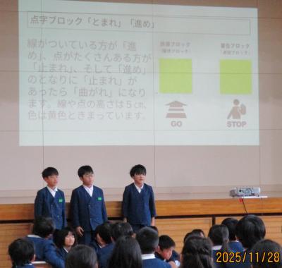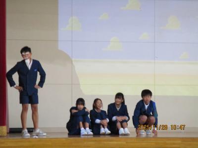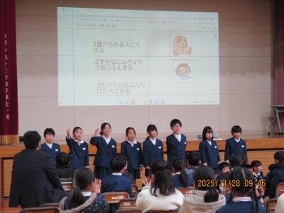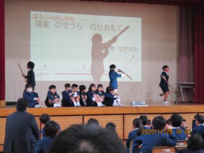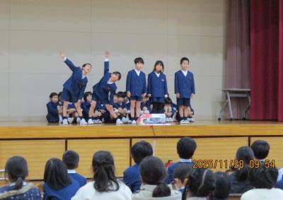 2年生は生活科の町探検で学んだ「あがたのすてき つたえ隊」の発表。