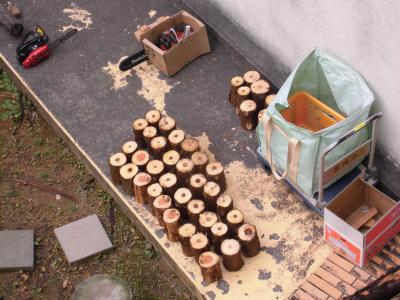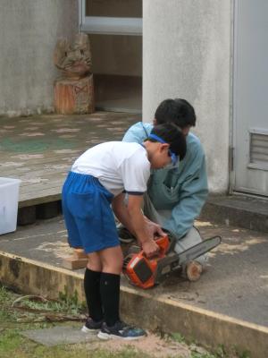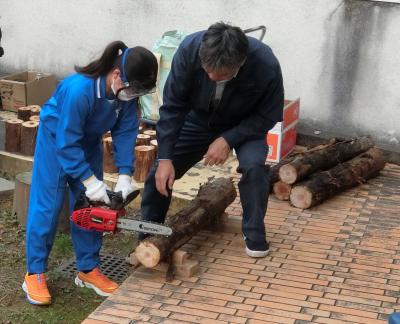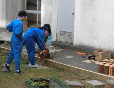 最後に、切り出した幹を一人一本使って、中庭に花壇の囲いを作り、真ん中に金木犀を植樹しました。