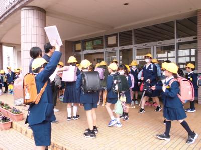 各地区の高学年が中心となって出欠確認をし、集団での登下校のきまりをしっかりと伝えていました。