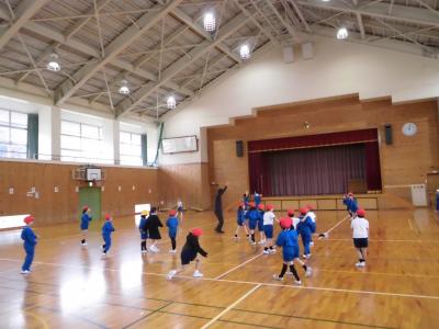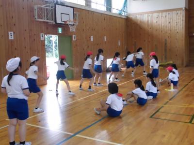 中学年は、踊りが上手になり、今は隊形移動の練習をしています。斜めに並ぶなど、難しい隊形もあります。体育館ではうまくできました!広い運動場でもうまくできるかな!?