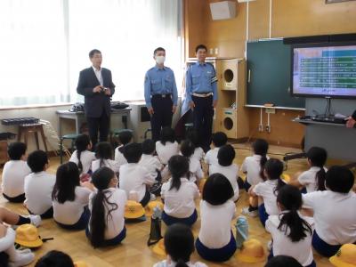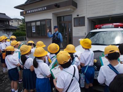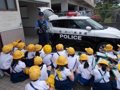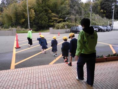 津幡警察署や能瀬交番の方、役場の方や保護者の方々に見守られながら、実際に歩いて交通ルールを確認しました。
