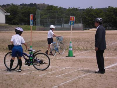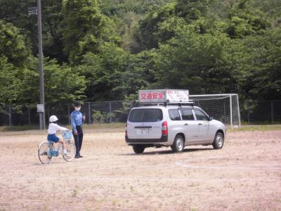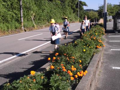 英田小学校は高台にあるため、坂が多く、見通しの悪い道路もあります。