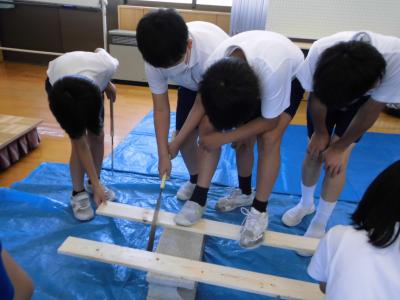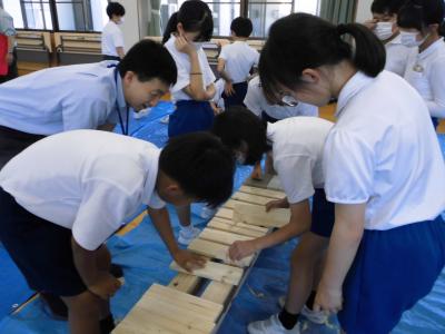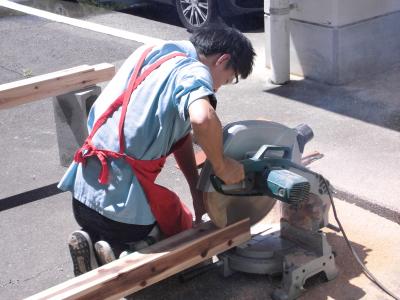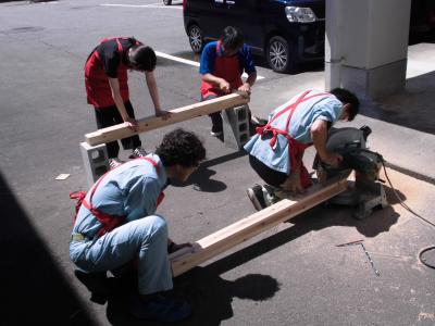 最後に、切り出した幹を一人一本使って、中庭に花壇の囲いを作り、真ん中に金木犀を植樹しました。