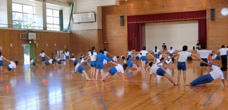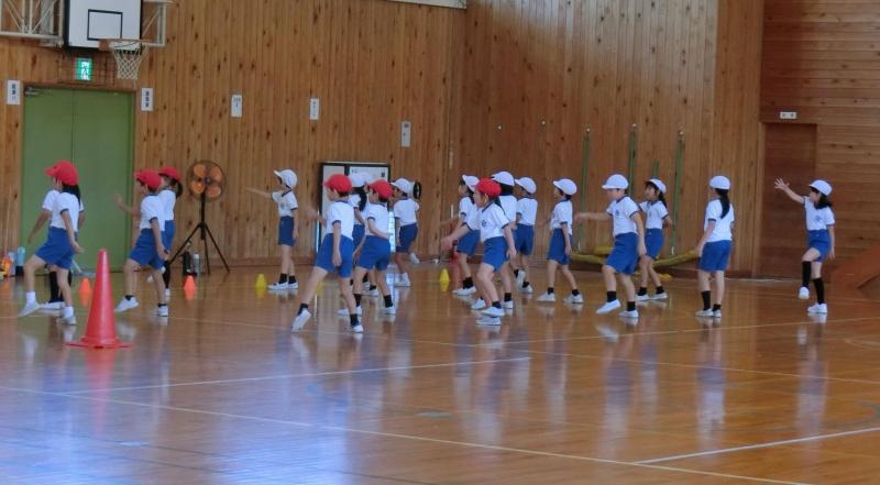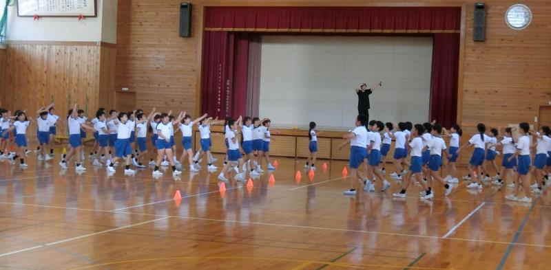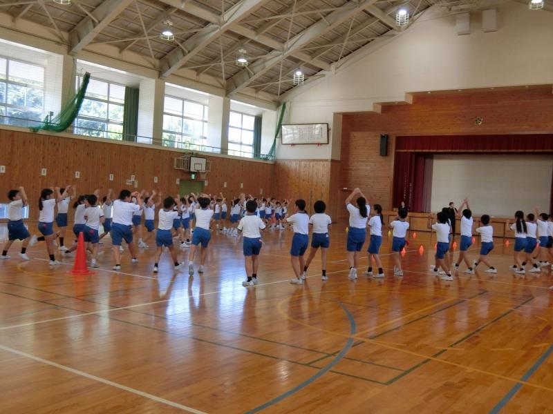中学年は、踊りが上手になり、今は隊形移動の練習をしています。斜めに並ぶなど、難しい隊形もあります。体育館ではうまくできました!広い運動場でもうまくできるかな!?