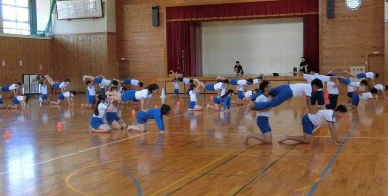 高学年は、個人技からだんだん人数が増え、大技へとレベルアップしています。みんな息を合わせて、真剣に練習に取り組んでいます。本番ではどんな技が見られか、楽しみです!
