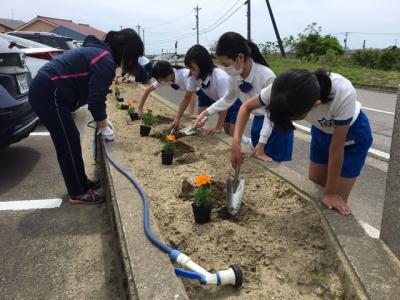 ゲストティーチャーの大浦さんから指導していただき,苗を植えていきました。初めはおそるおそるといった感じだったのですが,だんだん慣れてきて,思っていたより早く終了しました。上手に植えることができたので,大浦さんも驚いていました。