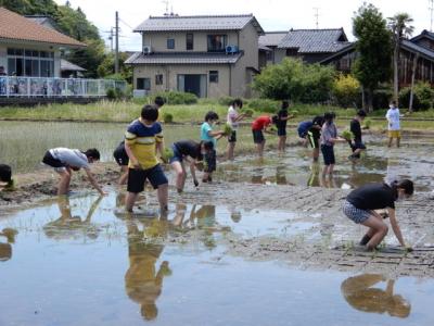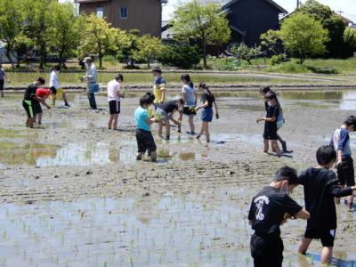 さわやかな五月晴れの中,5年生が田植え体験活動をしました。
