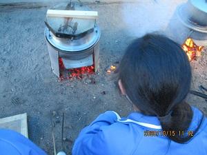 火おこしのスペシャリストの先生に教わりながら、今回は竹をなたで割るところから始めました。初めはおそるおそるの子どもたちも、上手になってくるとスパッと切れるるようになり、「気持ちいい‼」と言っている子もいました。着火剤は、松ぼっくりです。それに割った竹を組んで置き、火をつけていきました。みんないつしか、職人のように火ばさみを使えるようになっていて、感心しました。