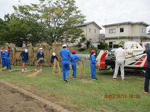 途中でちょっと機械の調子が悪くなった時には、急遽松本館長さんが、わらで縄をなう方法を実演してくれました。昔の方は、このわらを使って、いろんなものを編んだり作ったりしていたのですね。その方法なども調べてみると面白いかもしれません。機械も調子を取り戻し、あっという間に脱穀することができました。