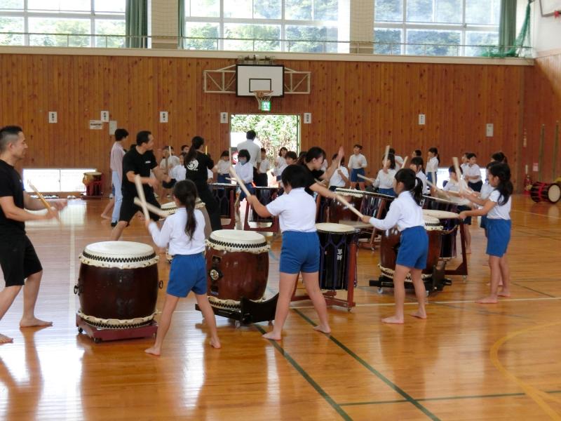 全校での鑑賞会の後、2年生が和太鼓の体験をさせてもらいました。全員がかわるがわる場所を移動しながら、和太鼓をたたきました。
