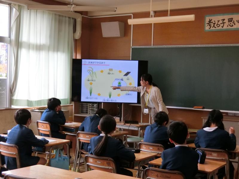 11月11日(月)、5年生を対象に特別栽培米についての授業がありました。この週1週間、給食で特別栽培米が使われることに伴い、特別栽培米のことを知ってもらおうと、県庁の方と農家の方がゲストティーチャーとして来てくださいました。5年生は春からお米づくりに取り組んできましたが、特別栽培米は普通のお米とどう違うのかを知ることができました。