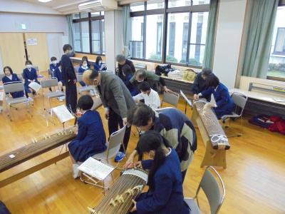 「春の海」「六段の調」の演奏を聞いたあと、琴の演奏体験をしました。三曲会のみなさんに教えていただきながら「さくら」の練習をし、最後にみんなで合わせて琴の演奏をしました。