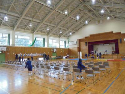 ステージや体育館壁の飾りつけや、机・イスの設置など、みんなで話し合い、協力し合いながら取り組む姿が見られました。