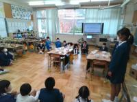 今日は1年生と能瀬保育園の年長さんとで、オンラインを使用した遊び交流会を行いました。本来なら学校に年長さんに来てもらい、一緒に活動をする予定だったのですが、新型コロナの感染予防のためGoogle Meetを使用し、お互いの遊びを紹介しました。