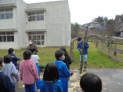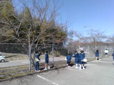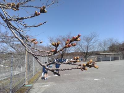 4年生の理科では年間を通して桜の観察をしています。冬の間、枝の先についていた小さな冬芽が徐々にふくらみ、今日の観察では、つぼみから花びらがのぞいていました。