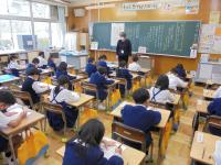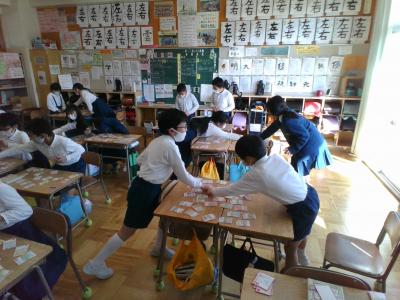 3年生は社会科で津幡町のことについて学習しています。今日はゲストティーチャーとして山崎さんをお招きし,カルタのことや津幡町のことについて教えていただきました。