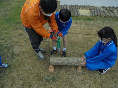 今日は4年生が,12月に原木切りをした椎の木にしいたけの元となるコマを植え付けました。