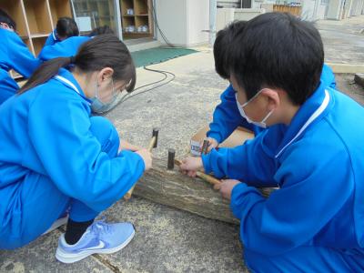 神崎さんをはじめとしたゲストティーチャーの方々に教わりながら,木にドリルで穴をあけ,その中にしいたけのコマを入れていきました。3人一組,みんなで協力しながら約70本あった椎の木全部に植菌することができました。