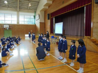 今日は卒業式に出席する4・5年生で全員で、卒業式の在校生練習を行いました。式に出席する際の心構えや姿勢、旅立ちの言葉、歌などの練習を行いました。