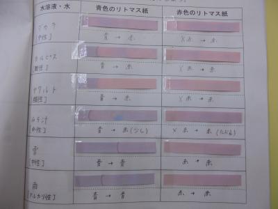 早速調べてみると,ダカラ,カルピス,ヤクルトは青のリトマス紙がはっきりと赤に変わりました。つまり酸性です。みそ汁はやや青のリトマス紙が紫になりました。弱い酸性です。雪と雨は中性でした(酸性でなくてよかったです)。
