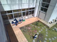 暖かい日差しの中、昼休みの中庭は、遊んでいる子やひなたぼっこをしている子などで賑わっていました。花が咲いて大きくなリ、中庭はとても気持ちの良い場所となっています。