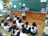 田植えのときに植える稲はどのように育てるのか、またどこで育てているのかなど、実際に苗を持ってきていただきお話をしていただきました。子どもたちは興味津々で、驚きや感心の声を上げながら大浦さんの話を聞いていました。