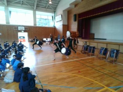 今日は津幡町の和太鼓チーム「朝霞太鼓」さんにお越しいただき、和太鼓演奏会を行いました。太鼓の体に響く大きな音と演者の皆さんの勇壮な姿に体育館にいたみんなが引き込まれていきました。先生方も飛び入りで参加しました。