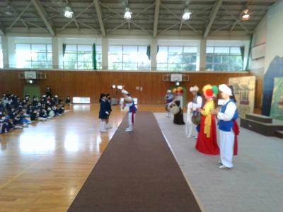 6年生と劇団のみなさんによる歌から始まり、迫力ある民族楽器の演奏に歌や踊りと、あっという間に物語の世界に引き込まれていきました。