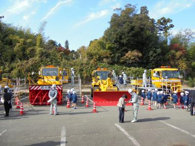 学校の駐車場に大きな重機が4台。これは県の土木事務所が除雪に使う実際の除雪車たちです。これから雪の季節を迎え、活躍するはたらく車なのですが、除雪をしているときは危なくて近寄ることはできません。