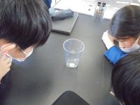 続いて、逆さにした「ろうと」にストローとポリエチレンのふくろを付け、ふっとうしたときに出てくるあわを集めます。しばらく加熱しふっとうすると、ポリエチレンのふくろがくもり始め、やがてふくらみます。そこで火を止め、しぼむのを待つと、ふくろの中には水が集まっています。ぶくぶく出てくる泡の正体も「水」なんですね。正確に言うとあわは「水じょう気」でそれが冷やされて「水」になったんですね。
