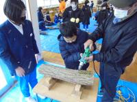 今日は、昨年の11月に切りそろえたしいたけの原木(くぬぎなど)に「コマ」を植え付ける植菌体験学習をしました。ドリルで穴を開けたあと、その穴にしいたけのもととなるコマを詰めていきました。