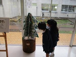 ツリーの足元の鉢は、森の恵み事業でお世話になっている方々から頂いたプランターカバーです。こんな素敵なクリスマスツリーがある学校は、きっと英田小学校だけですね。全学年のものが貼られて1本のツリーに仕上がるのが本当に楽しみです。
