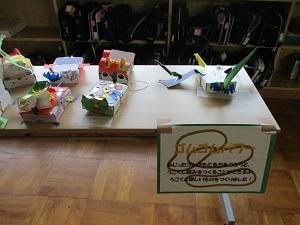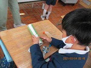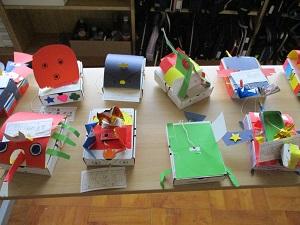 ゴムのもどる力を利用して、動くおもちゃを作りました。理科の「風やゴムのはたらき」の学習と関連していますね。どんな動きをするのか、触って確かめてみたくなりました。