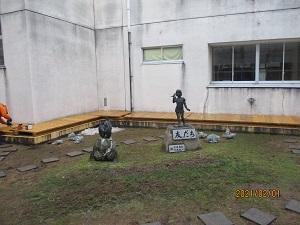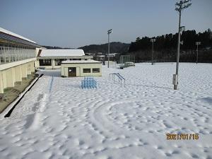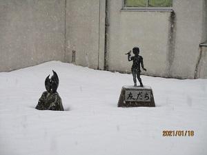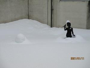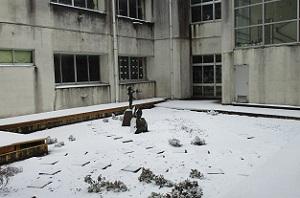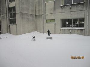 中庭のペンギンたちも、雪に埋まってしまいました。飼育小屋のうさぎのチョコは元気でしたが、百葉箱の足は埋まり、ジャングルジムもかなり埋まっていました。本当に大変な大雪になりました。
