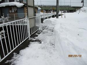 学校から学童側の道も、何とか下の押しボタン信号のところまでは歩ける道を除雪することができました。ところどころデコボコしてはいますが、道路ではなく歩道を歩けるようになっています。