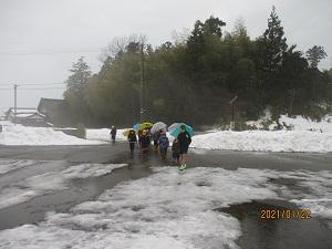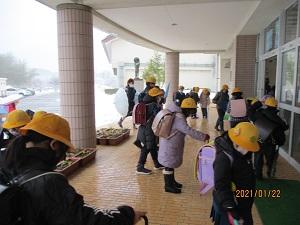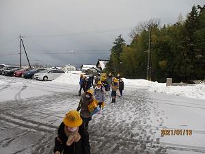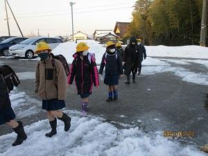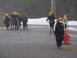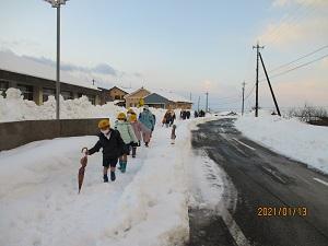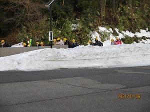 集団登校では、上の学年の子達が下級生をかばいながら、一生懸命歩いてきました。保護者の方も心配で一緒に歩いてくださるところも多くありました。本当にありがとうございました。学校に着いた高学年の子どもたちは、すぐに除雪を手伝ってくれました。おかげで学校の玄関前や正面から公民館への歩道や学童側の歩道あたりまでなんとか除雪できました。しかし、学校へ上ってくる道の除雪が追い付かず、車で送ってくださった保護者の皆さんには、ご迷惑をおかけしました。下校時までには業者さんに前の道を除雪してもらうことができました。