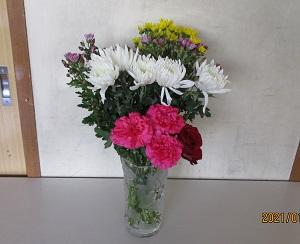 玄関には、とても素敵なお花が飾られています。試験管立てには「種小学校」の文字もうっすら見えて、なんだか種小学校の建物や理科室を思い出しました。とても懐かしく温かい気持ちになりました。