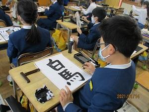 そして12月には、書写の授業で何度か書初めの練習をします。今日は5年生の2クラスが、ちょうど練習していました。