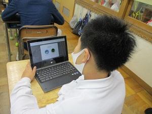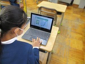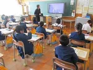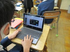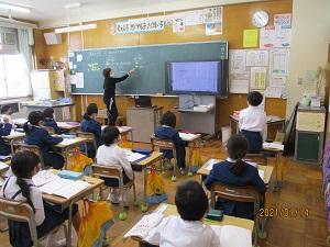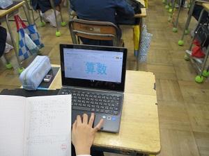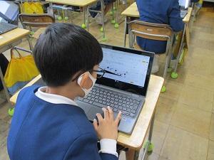3年生。算数科少人数の授業では、前の時間の復習に、ほとんどの児童が挙手していました。また、昨日の続きのパソコン室での授業も頑張っていました。