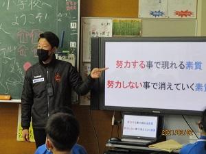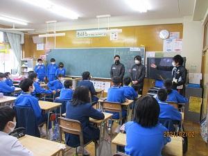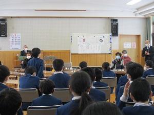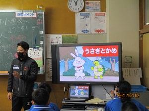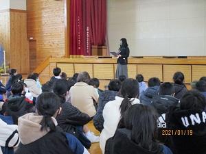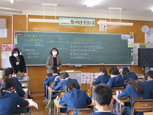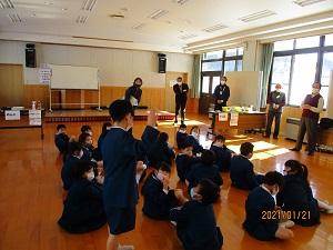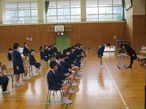 まず校長先生から、今年の干支「辛丑(かのとうし)」の話を聞きました。「辛(かのと)」の「草木が枯れ新しくなろうとしている状態」という意味と、「丑」の「種から芽が出ようとする状態」という意味が合わさり、「何かが終わり新しい出発の兆しが見える年」になるのだそうです。コロナ禍が終息し、英田小の子どもたちがさらに一歩前進する、そんな年になるといいですね。また3学期のスローガン「発展」も伝えました。次の学年に向けて、友だちと力を合わせ、共にジャンプするそんな3学期になってほしいという。その後、学習目標、生活目標の話を聞きました。みんな真剣に聞いてくれていました。