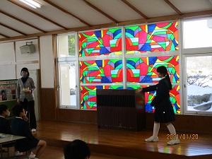 始めに、「鶴と亀」という影絵劇を観ました。このお話に出てくる魚・蝶・蛙・小亀の人形を作った子どもたちが裏方で参加しました。とっても上手に動かすことができましたね。本当にきれいな影絵劇で、子どもたちの心にずっと残る体験ができたように思います。