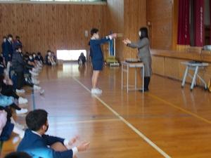 まずは、読書賞の表彰を行いました。今年一年間で、決められた冊数の本を読めた人は、読書賞の賞状をもらうことができます。代表の5年生は、一年間に300冊以上読破したそうです。素晴らしいことですね。