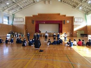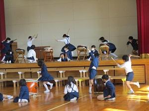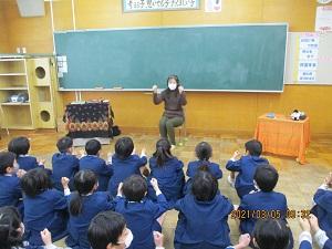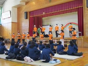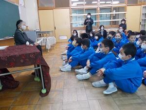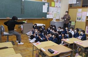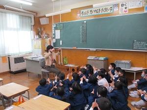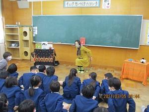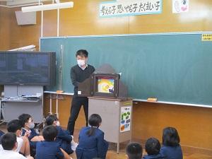 そんな中、文化庁「文化芸術による子供の育成事業」として、劇団「影法師」の皆さんによる影絵劇を鑑賞しました。3・4限目は1~3年生、5・6限目は4~6年生と2回にわけて実施しました。