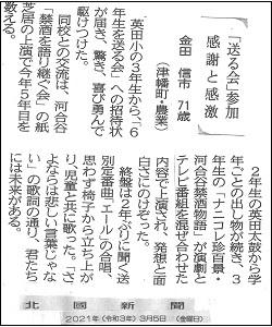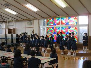 2限目は在校生との全体練習でした。最後の15分間は、1・2・3年生も一緒に参加して、「変わらないもの」を全校合唱し、その後1~5年生全員で6年生の退場を拍手で送りました。大好きな6年生が卒業してしまうことに感極まって涙ぐむ1年生がいて、わたしもぐっときてしまいました。本来なら、みんなでお祝いしてあげたかったところですが、その分4・5年生が一生懸命頑張ってくれることでしょう。