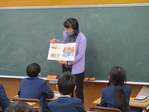 先生方による朝の本の読み聞かせを定期的に行っています。今日は校長先生が5年生に読み聞かせをしました。新美南吉の「巨男の話(おおおとこのはなし)」です。