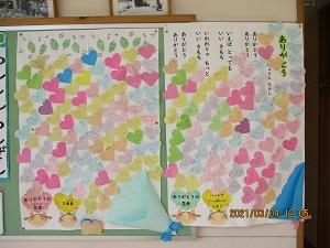 2月から、毎日お昼に放送してきた「ありがとうの花束~ハートで感謝の気持ちを伝えよう~」の取組です。みんなから募集したありがとうの花束が3束になりました。とっても嬉しいですね。