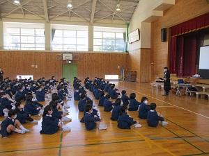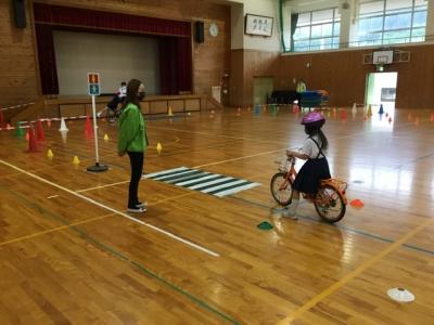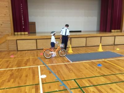 津幡警察署,能瀬駐在,町役場の方々を講師としてお迎えし,自転車安全教室を行いました。今日は雨のため,体育館の中にコースを設け練習しました。自転車の点検の仕方,横断歩道や一旦停止,踏切の安全な渡り方などを教わりました。お巡りさんさんのお話では,自転車に乗り始めた頃が1番事故が多いそうです。くれぐれも交通ルールをしっかり守って,安全に自転車に乗ってください。