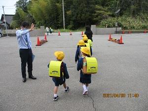 各グループに分かれ,PTA生活指導部・保護者の方についていただき,横断歩道の正しい渡り方や信号のある横断歩道で守らなければいけないことなどを教えていただきました。
