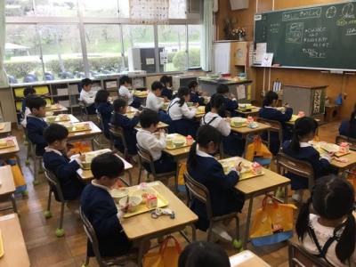 小学校の給食はおいしいかな?残さず食べられるかな?など,期待と不安が入り混じっていたかもしれませんね。6年生のお兄さんお姉さんが配膳をしてくれている間も,行儀よく待つことができました。
