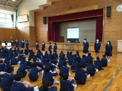 各学級代表の紹介,児童委員会の委員長によるめあての発表などがありました。5月のテーマは「整えよう!モノ・場所・こころ(人)」です。このテーマをもとに,子どもたち自身が目標を考え,活動に取り組んでいます。